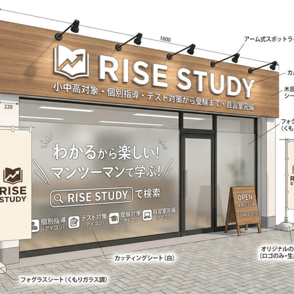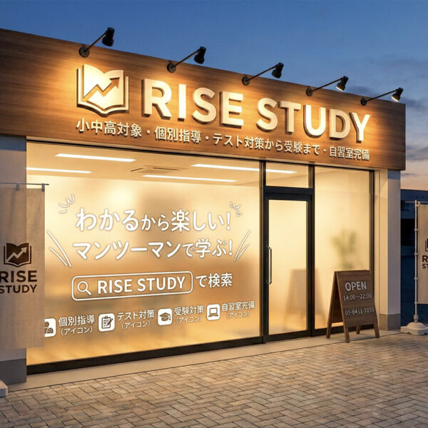 学習塾「RISE STUDY」様より、店舗の看板デザインから製作、施工までを一貫してご依頼いただいた看板事例となります!