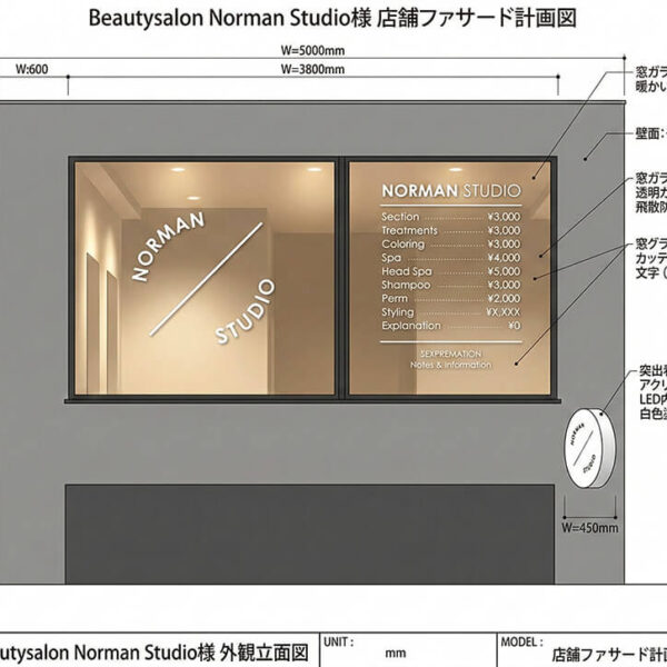 美容室「Norman Studio」様より、店舗ファサード(外観)の看板デザインおよび施工をご依頼いただいた事例です。モルタル仕上げのスタイリッシュな外壁に調和する、シンプルで洗練されたサイン計画をご提案いたしました。